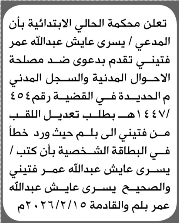 تعلن محكمة الحالي بأن المدعيه يسرى عايش تقدم بطلب تصحيح اسم غير مصنف On فبراير 13, 2026 Share Share FacebookTwitterWhatsAppTelegramGoogle+البريد الإلكترونيPrint
