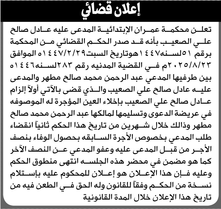 تعلن محكمة عمران للمدعى عليه عادل الصعيب بالحكم الصادر إعلاناتمحاكم On فبراير 13, 2026 Share Share FacebookTwitterWhatsAppTelegramGoogle+البريد الإلكترونيPrint