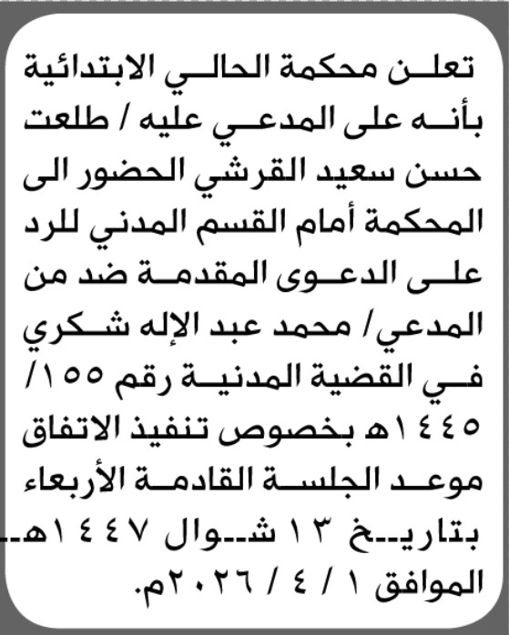 تعلن محكمة الحالي أن على المدعى عليه طلعت القرشي الحضور إلى المحكمة إعلاناتمحاكم On فبراير 14, 2026 Share Share FacebookTwitterWhatsAppTelegramGoogle+البريد الإلكترونيPrint