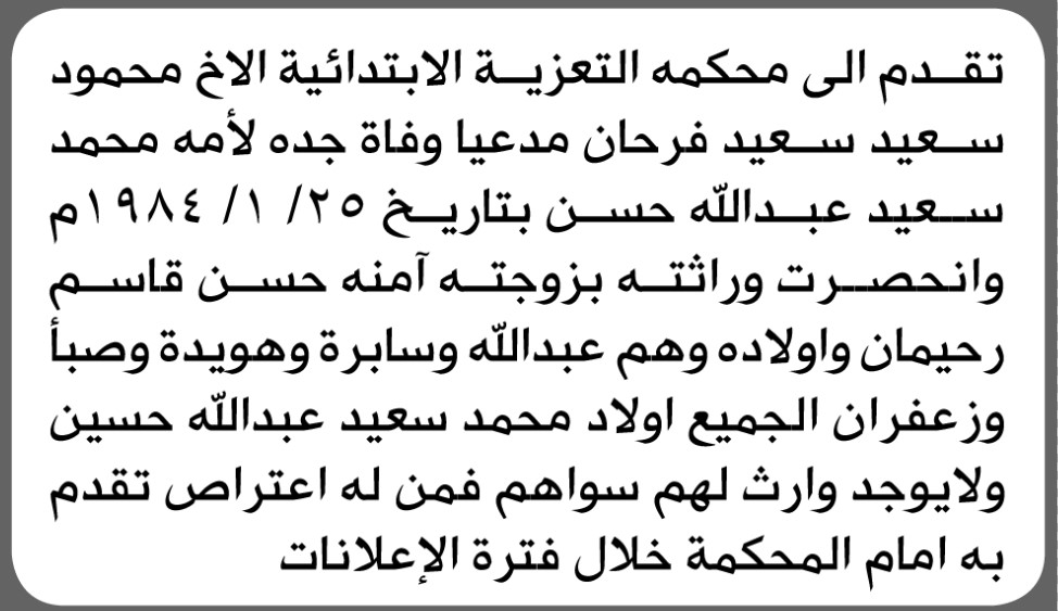 تعلن محكمة التعزية أن الأخ محمود فرحان تقدم بدعوى انحصار وراثة إعلاناتمحاكم On فبراير 15, 2026 Share Share FacebookTwitterWhatsAppTelegramGoogle+البريد الإلكترونيPrint