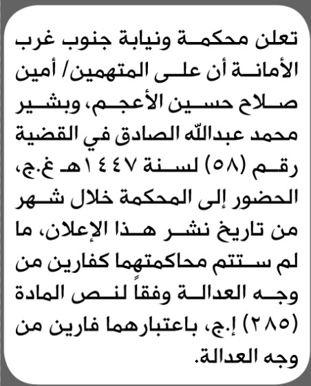 تعلن محكمة ونيابة جنوب غرب الأمانة أن على المتهمين أمين الأعجم الحضور إلى المحكمة إعلاناتمحاكم On فبراير 15, 2026 Share Share FacebookTwitterWhatsAppTelegramGoogle+البريد الإلكترونيPrint
