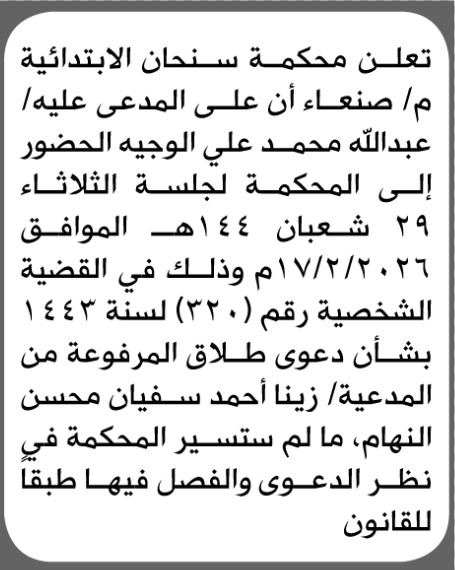 تعلن محكمة سنحان الابتدائية بأن على/ عبدالله محمد الوجيه الحضور إلى المحكمة إعلاناتمحاكم On فبراير 15, 2026 Share Share FacebookTwitterWhatsAppTelegramGoogle+البريد الإلكترونيPrint