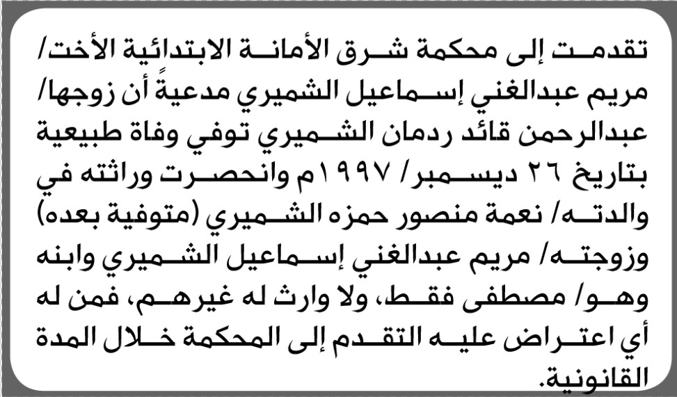 تعلن محكمة شرق الأمانة بأن الأخت/ مريم عبدالغني الشميري تقدمت إليها بطلب انحصار وراثة إعلاناتمحاكم On فبراير 15, 2026 Share Share FacebookTwitterWhatsAppTelegramGoogle+البريد الإلكترونيPrint