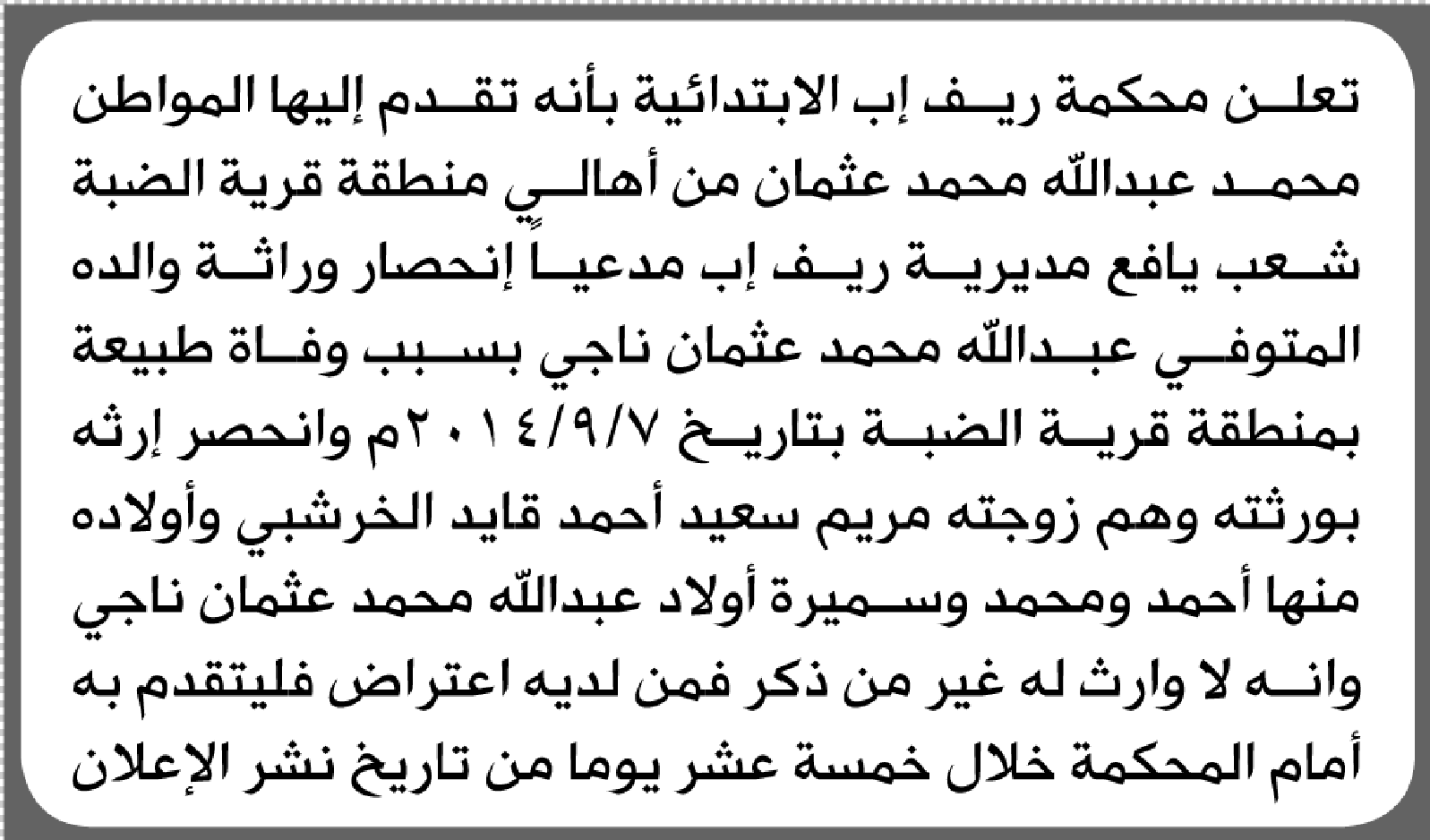 تعلن محكمة ريف إب بأن الأخ/ محمد عبدالله عثمان تقدم إليها بطلب انحصار وراثة إعلاناتمحاكم On فبراير 16, 2026 Share Share FacebookTwitterWhatsAppTelegramGoogle+البريد الإلكترونيPrint