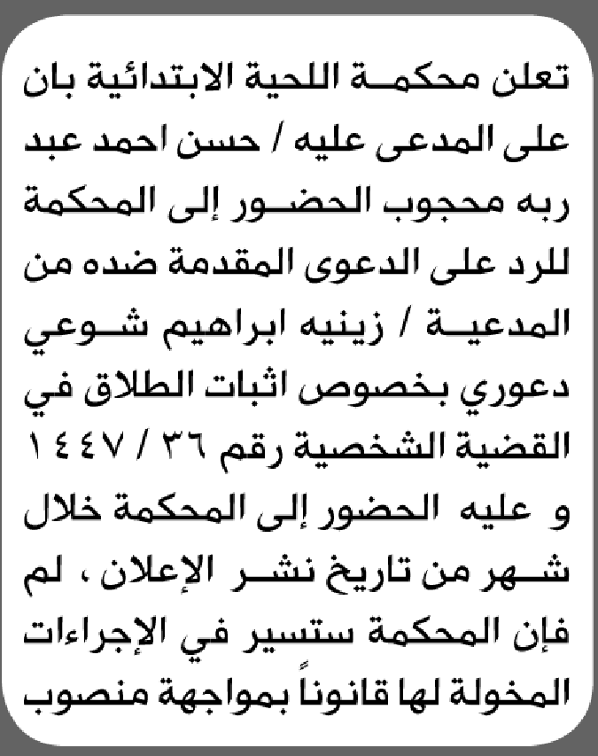 تعلن محكمة اللحية الابتدائية بأن على/ حسن أحمد محجوب الحضور إلى المحكمة إعلاناتمحاكم On فبراير 16, 2026 Share Share FacebookTwitterWhatsAppTelegramGoogle+البريد الإلكترونيPrint