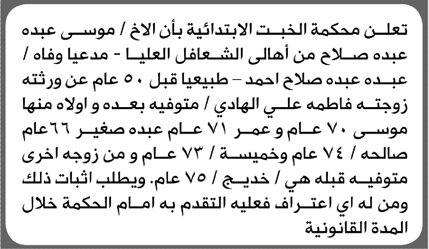 تعلن محكمة الخبت الابتدائية بأن الأخ/ موسى عبده صلاح تقدم إليها بطلب انحصار وراثة إعلاناتمحاكم On فبراير 16, 2026 Share Share FacebookTwitterWhatsAppTelegramGoogle+البريد الإلكترونيPrint