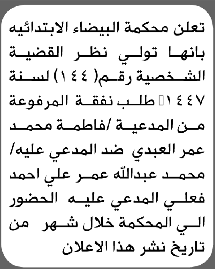 تعلن محكمة البيضاء أن على المدعى عليه محمد عبدالله عمر الحضور إلى المحكمة إعلاناتمحاكم On فبراير 16, 2026 Share Share FacebookTwitterWhatsAppTelegramGoogle+البريد الإلكترونيPrint