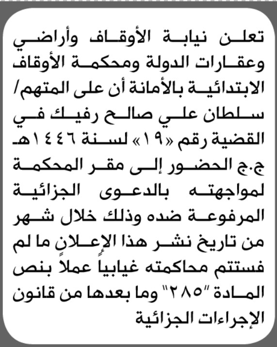 تعلن نيابة ومحكمة الأوقاف الابتدائية بأن على/ سلطان علي رفيك الحضور إلى المحكمة إعلاناتمحاكم On فبراير 18, 2026 Share Share FacebookTwitterWhatsAppTelegramGoogle+البريد الإلكترونيPrint