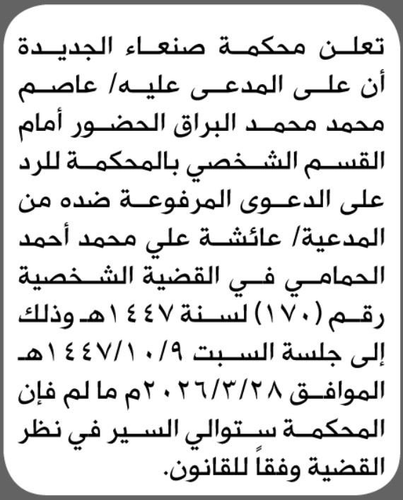 تعلن محكمة صنعاء الجديدة بأن على/ عاصم محمد البراق الحضور إلى المحكمة إعلاناتمحاكم On فبراير 18, 2026 Share Share FacebookTwitterWhatsAppTelegramGoogle+البريد الإلكترونيPrint