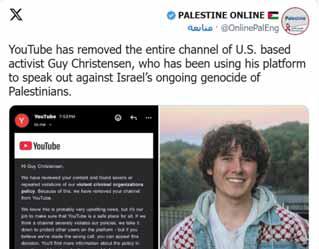 أعادت منصة YouTube التابعة لشركة Google تفعيل حساب الناشط الأمريكي البارز غاي كريستنسن بعد ساعات من إغلاقه، وذلك عقب موجة انتقادات وضغوط واسعة على منصات التواصل الاجتماعي، واتهامات للمنصة بممارسة تضييق على المحتوى المتضامن مع الفلسطينيين.