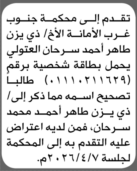 تعلن محكمة جنوب غرب الأمانة أن الأخ ذي يزن العتولي تقدم بطلب تصحيح اسمه إعلاناتمحاكم On فبراير 19, 2026 Share Share FacebookTwitterWhatsAppTelegramGoogle+البريد الإلكترونيPrint