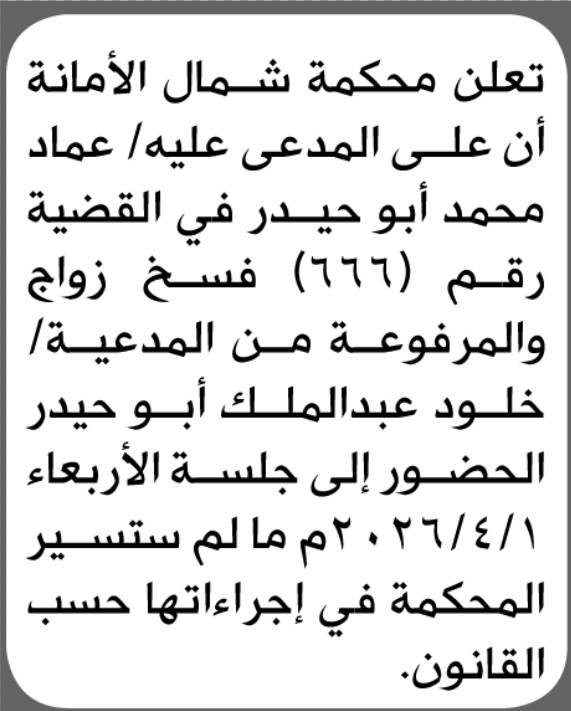 تعلن محكمة شمال الأمانة أن على المدعى عليه عماد أبو حيدر الحضور إلى المحكمة إعلاناتمحاكم On فبراير 19, 2026 Share Share FacebookTwitterWhatsAppTelegramGoogle+البريد الإلكترونيPrint