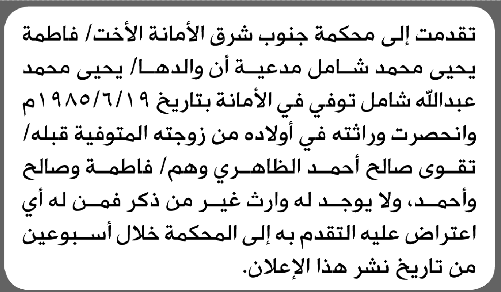 تعلن محكمة جنوب شرق الأمانة أن الأخت فاطمة شامل تقدمت بدعوى انحصار وراثة إعلاناتمحاكم On فبراير 20, 2026 Share Share FacebookTwitterWhatsAppTelegramGoogle+البريد الإلكترونيPrint