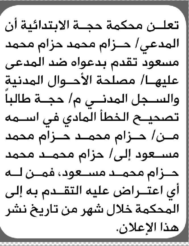 تعلن محكمة حجة الابتدائية بأن الأخ/ حزام محمد مسعود تقدم إليها بطلب تصحيح اسمه إعلاناتمحاكم On فبراير 22, 2026 Share Share FacebookTwitterWhatsAppTelegramGoogle+البريد الإلكترونيPrint