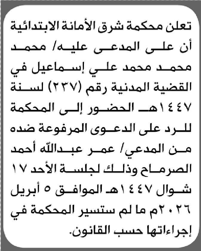 تعلن محكمة شرق الأمانة أن على المدعى عليه محمد محمد محمد الحضور إلى المحكمة إعلاناتمحاكم On فبراير 23, 2026 Share Share FacebookTwitterWhatsAppTelegramGoogle+البريد الإلكترونيPrint