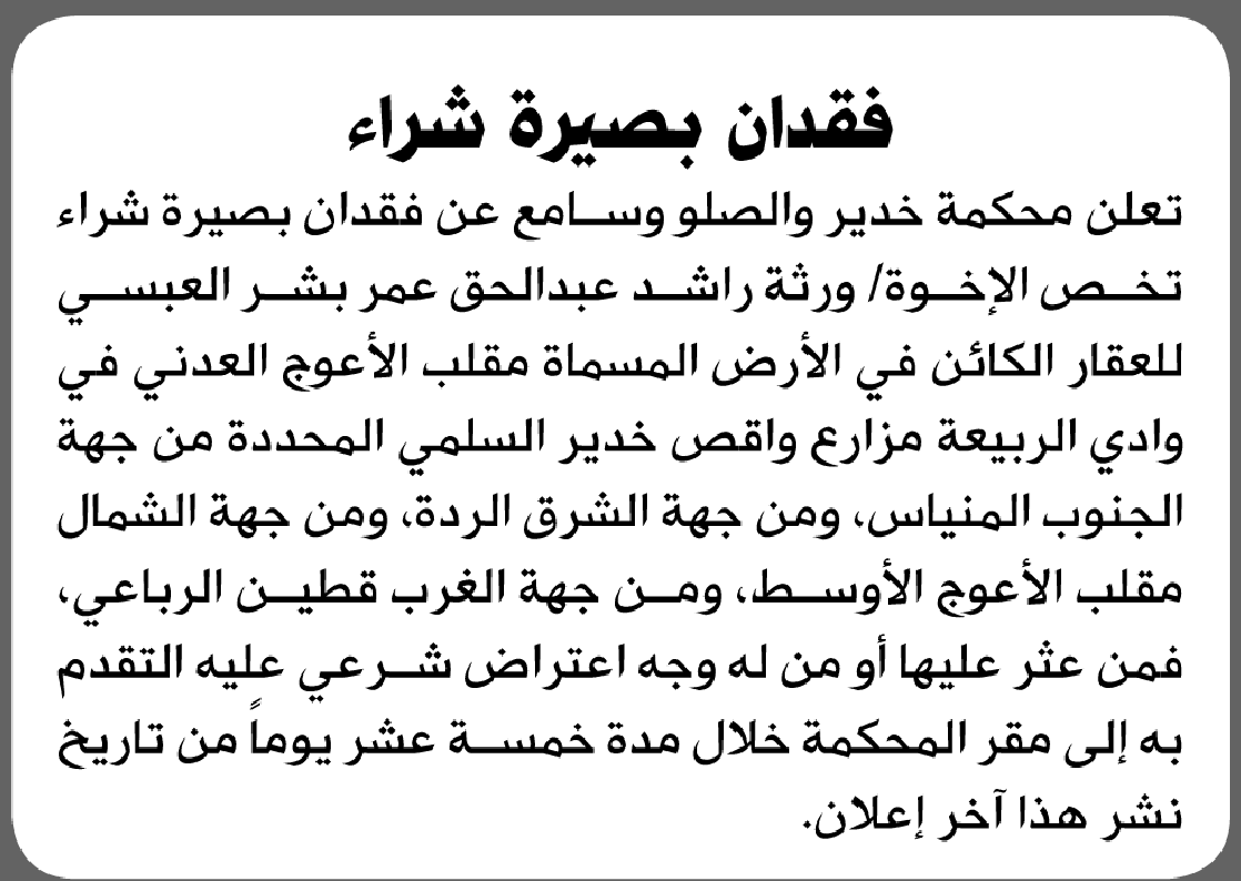 تعلن محكمة خدير والصلو وسامع عن فقدان بصيرة شراء تخص ورثة/ راشد عبدالحق العبسي إعلاناتفقدانات On فبراير 24, 2026 Share Share FacebookTwitterWhatsAppTelegramGoogle+البريد الإلكترونيPrint