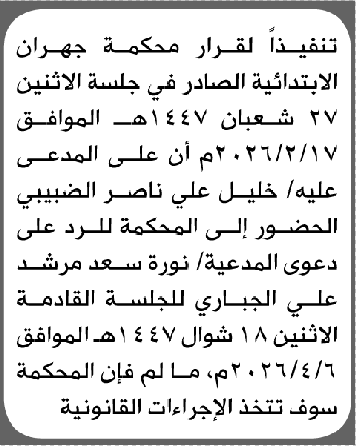 تعلن محكمة جهران أن على المدعى عليه خليل الضبيبي الحضور إلى المحكمة إعلاناتمحاكم On فبراير 24, 2026 Share Share FacebookTwitterWhatsAppTelegramGoogle+البريد الإلكترونيPrint