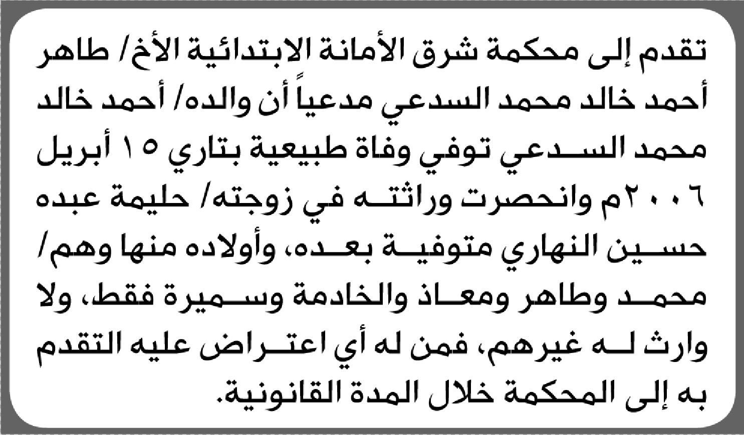 تعلن محكمة شرق الأمانة أن الأخ طاهر السدعي تقدم بدعوى انحصار وراثة إعلاناتمحاكم On فبراير 24, 2026 Share Share FacebookTwitterWhatsAppTelegramGoogle+البريد الإلكترونيPrint
