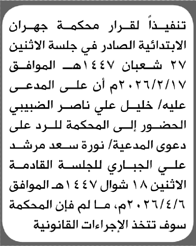 تعلن محكمة جهران أن على المدعى عليه خليل الضبيبي الحضور إلى المحكمة إعلاناتمحاكم On فبراير 25, 2026 Share Share FacebookTwitterWhatsAppTelegramGoogle+البريد الإلكترونيPrint
