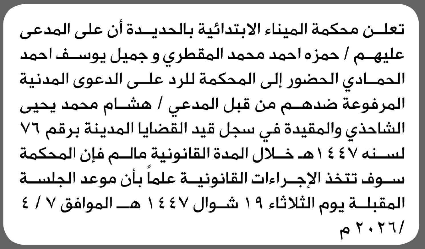 تعلن محكمة الميناء الابتدائية بأن على/ حمزة المقطري ويوسف الحمادي الحضور إلى المحكمة إعلاناتمحاكم On فبراير 25, 2026 Share Share FacebookTwitterWhatsAppTelegramGoogle+البريد الإلكترونيPrint