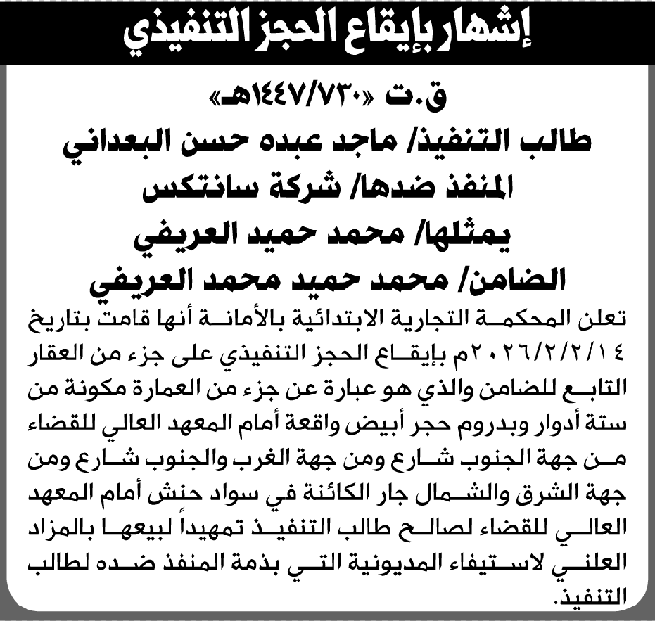 تعلن المحكمة التجارية بالأمانة عن حجز جزء من العقار التابع للمنفذ ضدها شركة سانتكس إعلاناتمحاكم On فبراير 26, 2026 Share Share FacebookTwitterWhatsAppTelegramGoogle+البريد الإلكترونيPrint