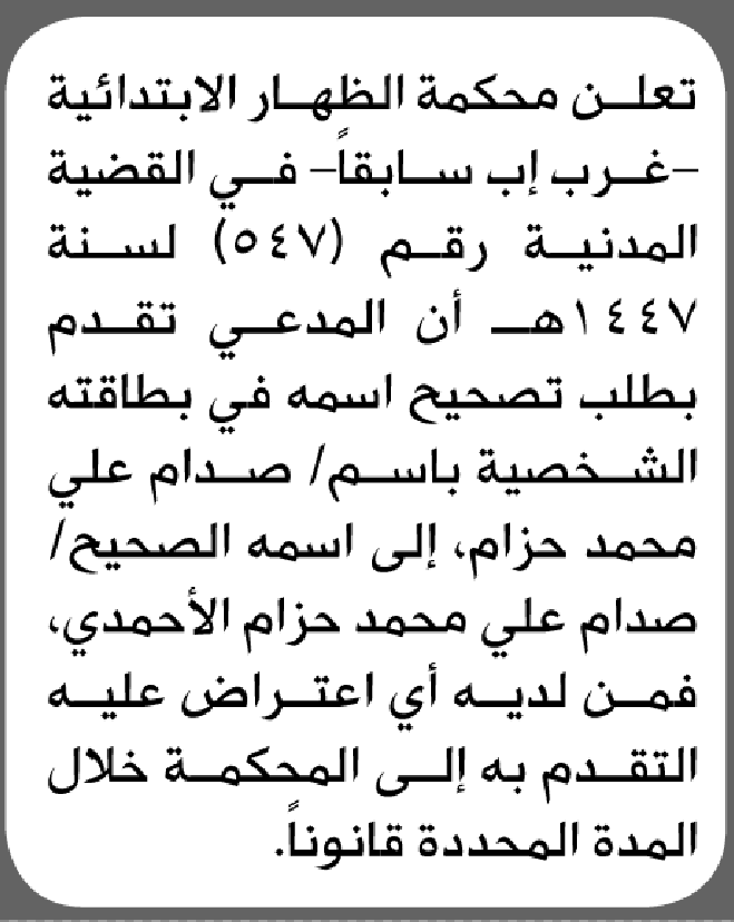 تعلن محكمة الظهار الابتدائية بأن الأخ/ صدام علي حزام تقدم إليها بطلب تصحيح اسمه إعلاناتمحاكم On فبراير 28, 2026 Share Share FacebookTwitterWhatsAppTelegramGoogle+البريد الإلكترونيPrint