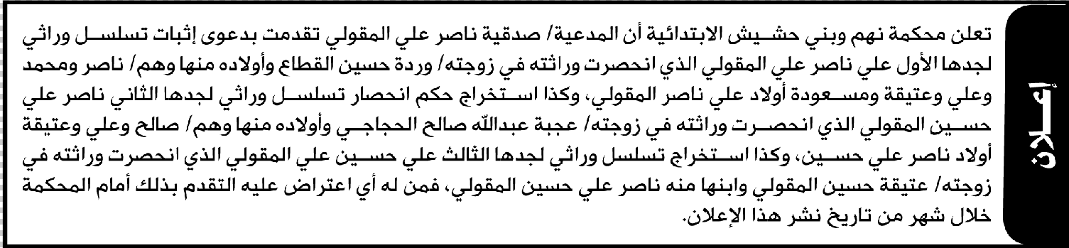 تعلن محكمة نهم أن المدعية صدقية ناصر المقولي تقدمت بدعوى اثبات تسلسل وراثي إعلاناتمحاكم On مارس 2, 2026 Share Share FacebookTwitterWhatsAppTelegramGoogle+البريد الإلكترونيPrint