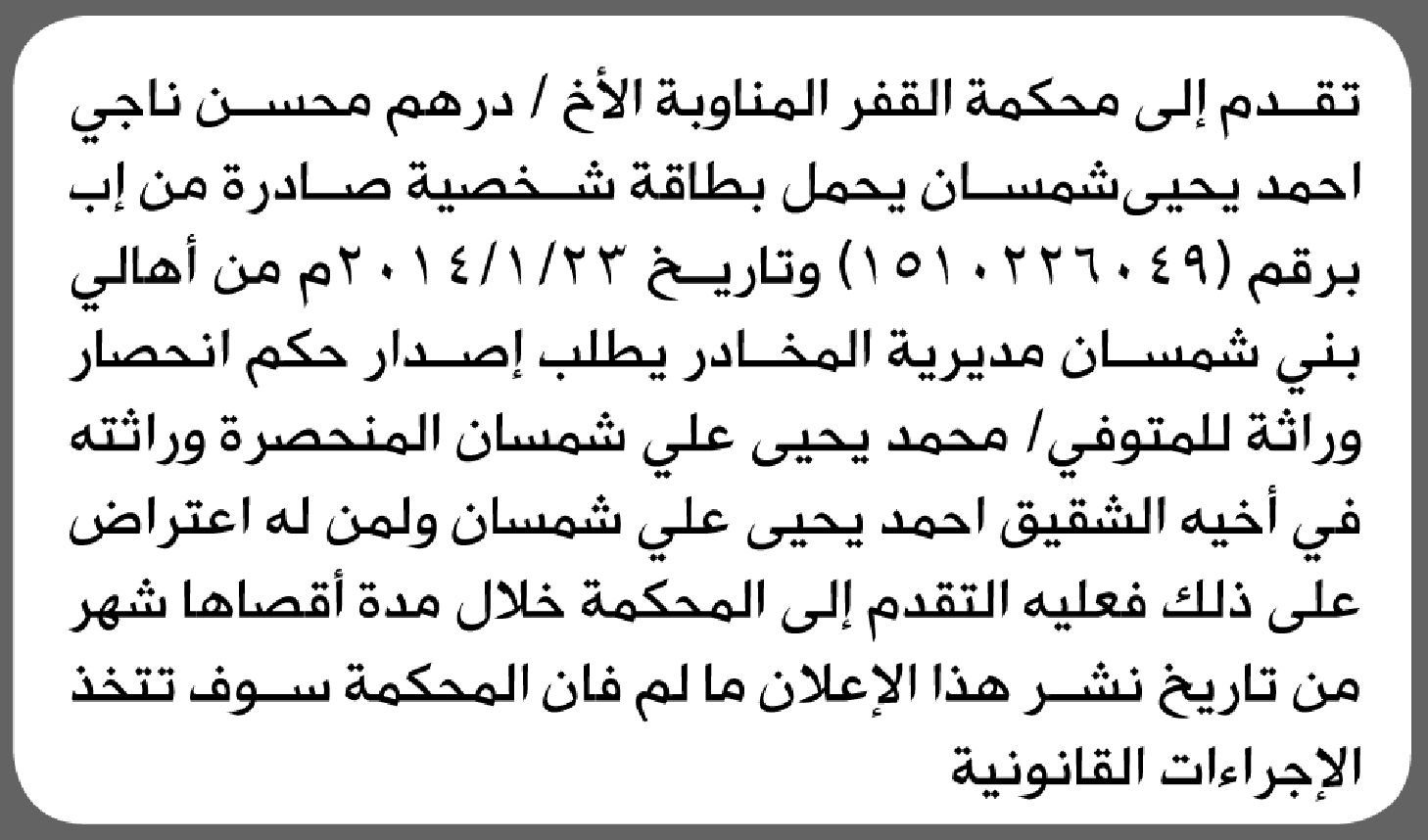 تعلن محكمة القفر أن الأخ درهم شمسان تقدم بدعوى انحصار وراثة إعلاناتمحاكم On مارس 3, 2026 Share Share FacebookTwitterWhatsAppTelegramGoogle+البريد الإلكترونيPrint