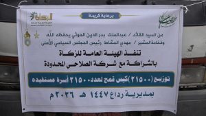دشن مكتب الهيئة العامة للزكاة بمحافظة البيضاء اليوم، توزيع 21 ألف و500 كيس قمح على الأسر المستفيدة في مديرية مدينة رداع،بالشراكة مع شركة الصلاحي المحدودة.