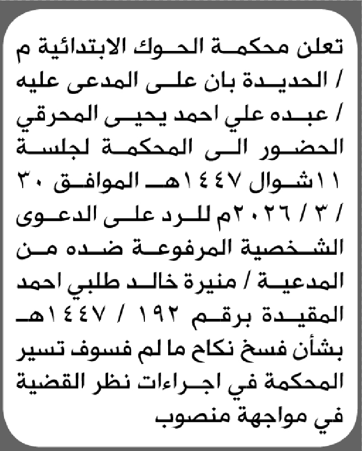 تعلن محكمة الحوك بأن على المدعى عليه عبده المحرقي الحضور الى المحكمة إعلاناتمحاكم On مارس 4, 2026 Share Share FacebookTwitterWhatsAppTelegramGoogle+البريد الإلكترونيPrint