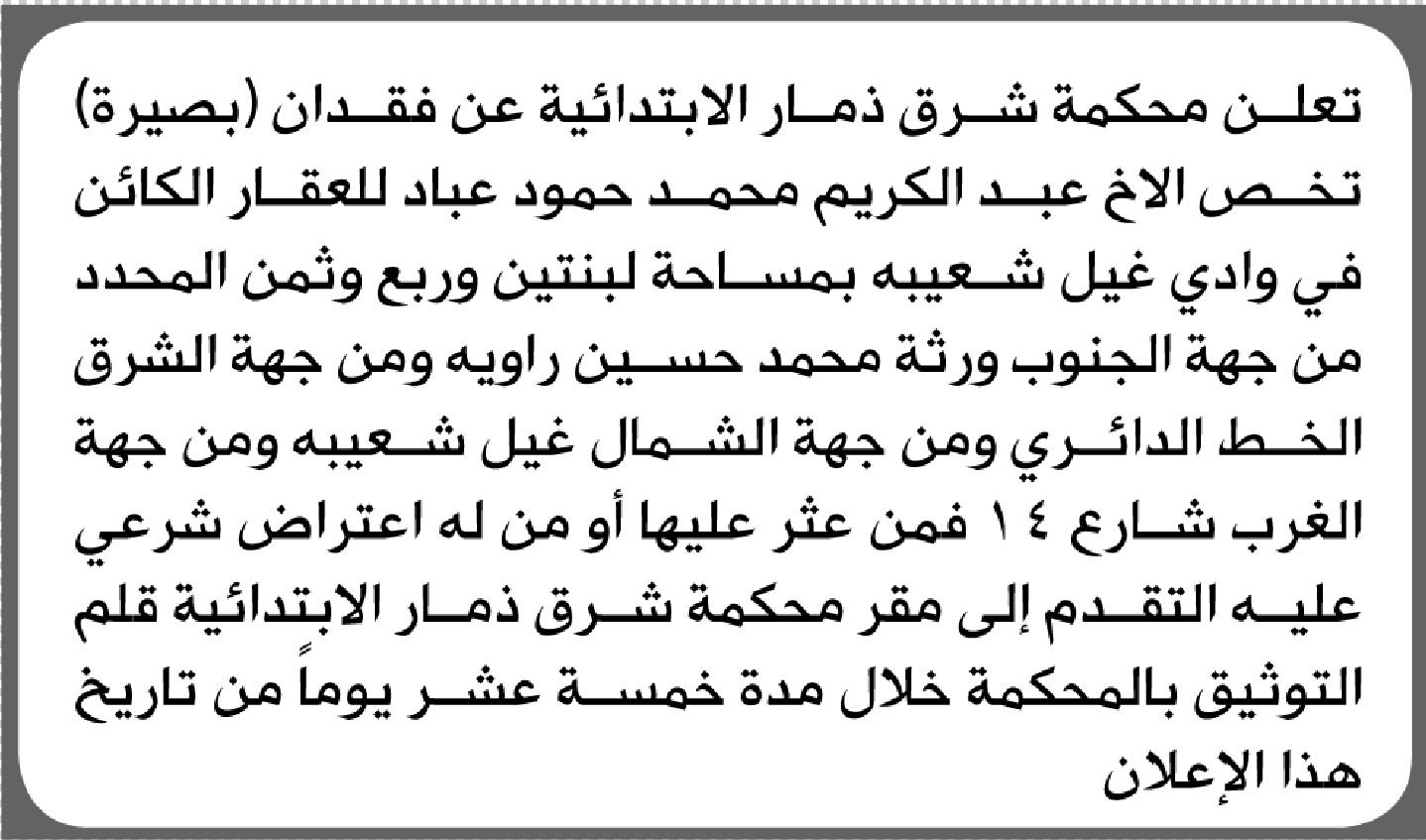 تعلن محكمة شرق ذمار عن فقدان بصيرة عبدالكريم عباد إعلاناتفقدانات On مارس 5, 2026 Share Share FacebookTwitterWhatsAppTelegramGoogle+البريد الإلكترونيPrint