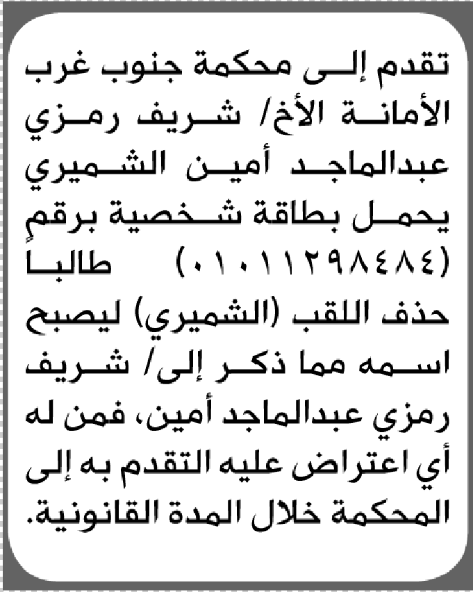 تقدم الى محكمة جنوب غرب الأمانة شريف الشميري بطلب تصحيح اسم إعلاناتمحاكم On مارس 6, 2026 Share Share FacebookTwitterWhatsAppTelegramGoogle+البريد الإلكترونيPrint