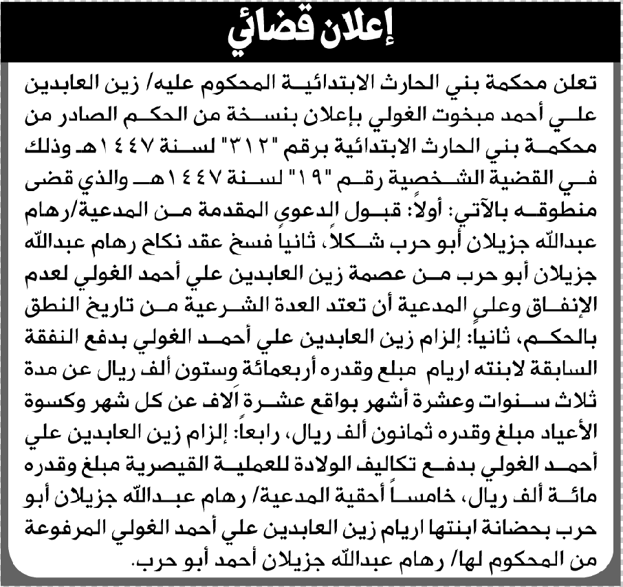 تعلن محكمة بني الحارث أن على زين العابدين الغولي قبول الدعوى إعلاناتمحاكم On مارس 6, 2026 Share Share FacebookTwitterWhatsAppTelegramGoogle+البريد الإلكترونيPrint