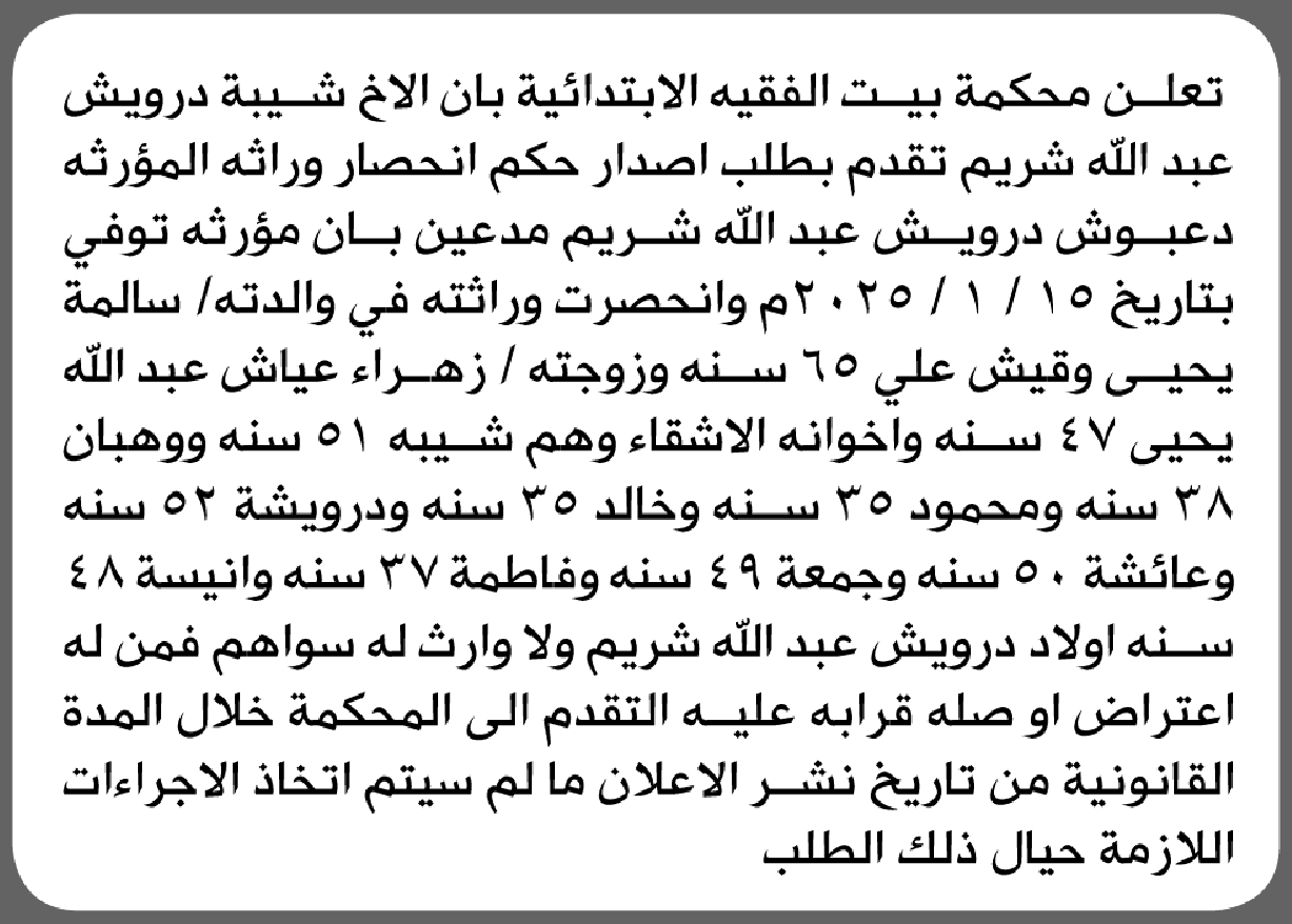 تعلن محكمة بيت الفقيه أن شيبة درويش تقدم بطلب إنحصار وراثة إعلاناتمحاكم On مارس 6, 2026 Share Share FacebookTwitterWhatsAppTelegramGoogle+البريد الإلكترونيPrint