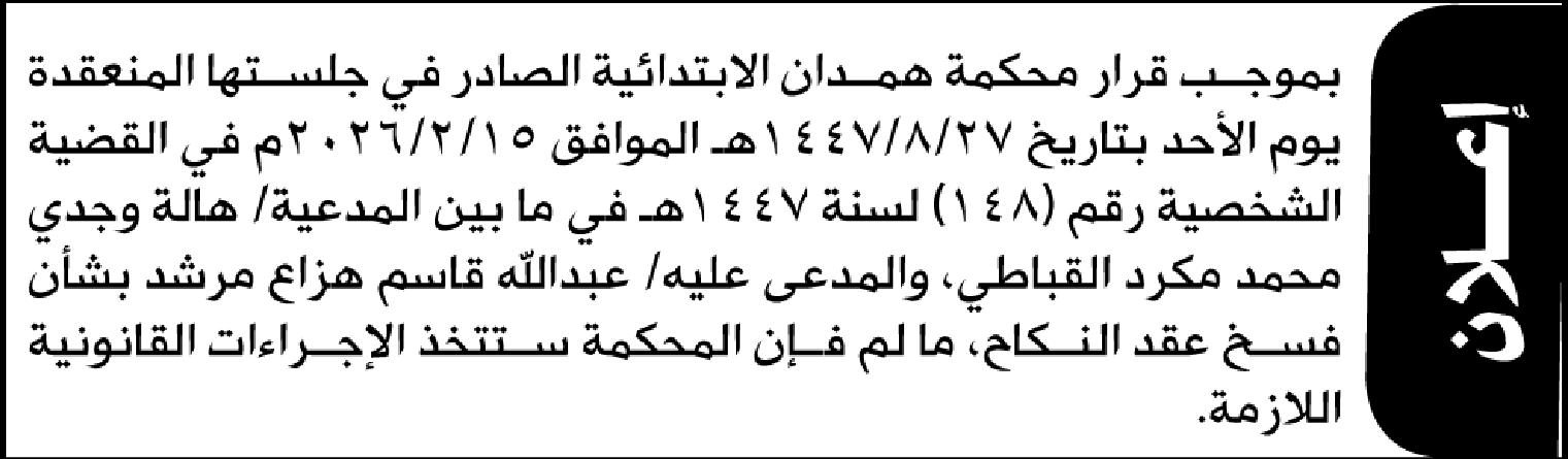 تعلن محكمة همدان الابتدائية بأن على/ عبدالله قاسم مرشد الحضور إلى المحكمة إعلاناتمحاكم On مارس 8, 2026 Share Share FacebookTwitterWhatsAppTelegramGoogle+البريد الإلكترونيPrint