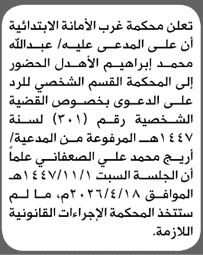 تعلن محكمة غرب الأمانة بأن على/ عبدالله محمد الأهدل الحضور إلى المحكمة إعلاناتمحاكم On مارس 9, 2026 Share Share FacebookTwitterWhatsAppTelegramGoogle+البريد الإلكترونيPrint