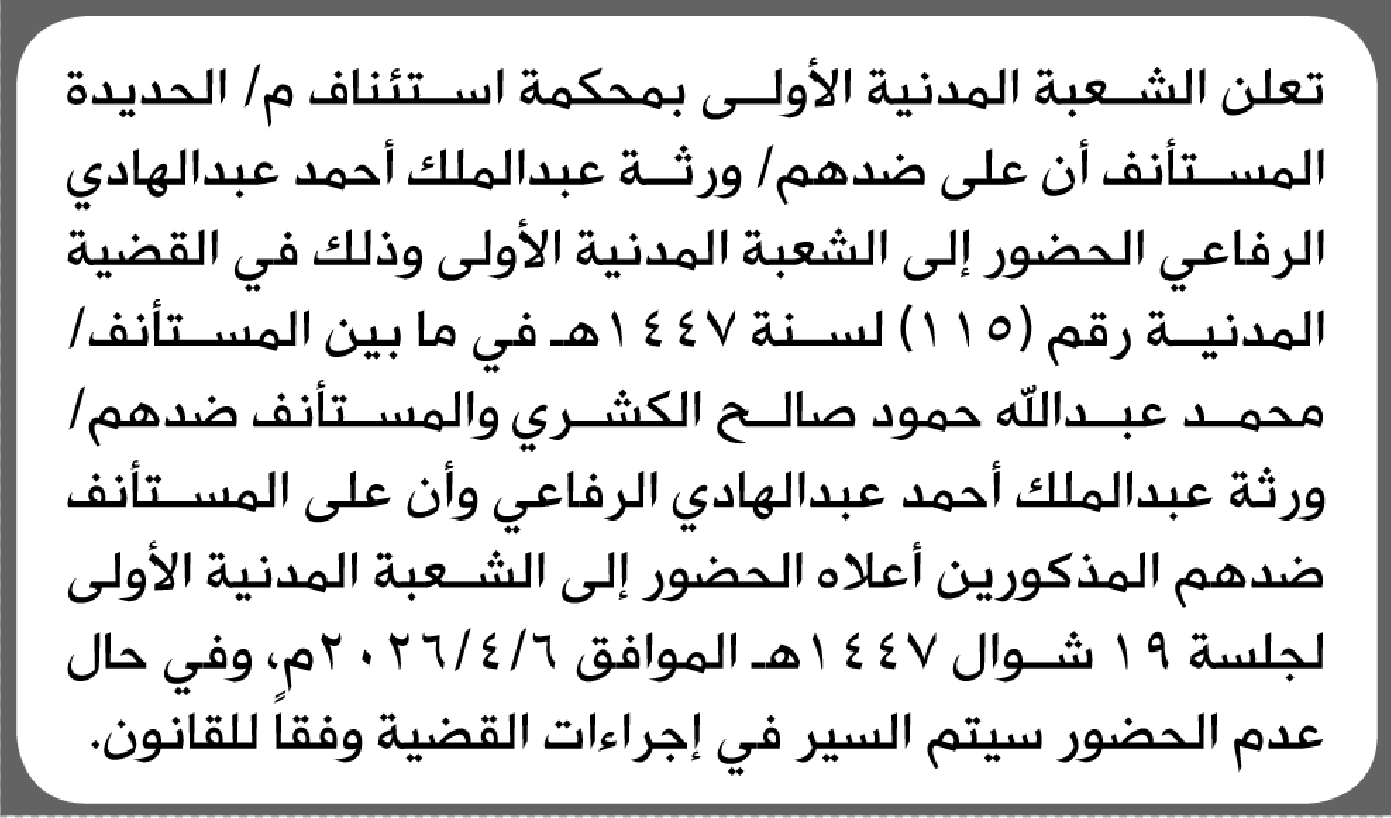 تعلن محكمة استئناف الحديدة أن على المستأنف ضدهم ورثة عبدالملك الرفاعي الحضور إلى المحكمة إعلاناتمحاكم On مارس 10, 2026 Share Share FacebookTwitterWhatsAppTelegramGoogle+البريد الإلكترونيPrint