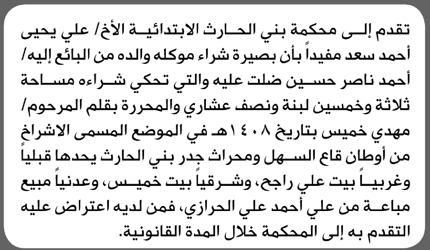 تعلن محكمة بني الحارث أن الأخ علي يحيى أحمد تقدم بدعوى فقدان بصيرة إعلاناتمحاكم On مارس 11, 2026 Share Share FacebookTwitterWhatsAppTelegramGoogle+البريد الإلكترونيPrint