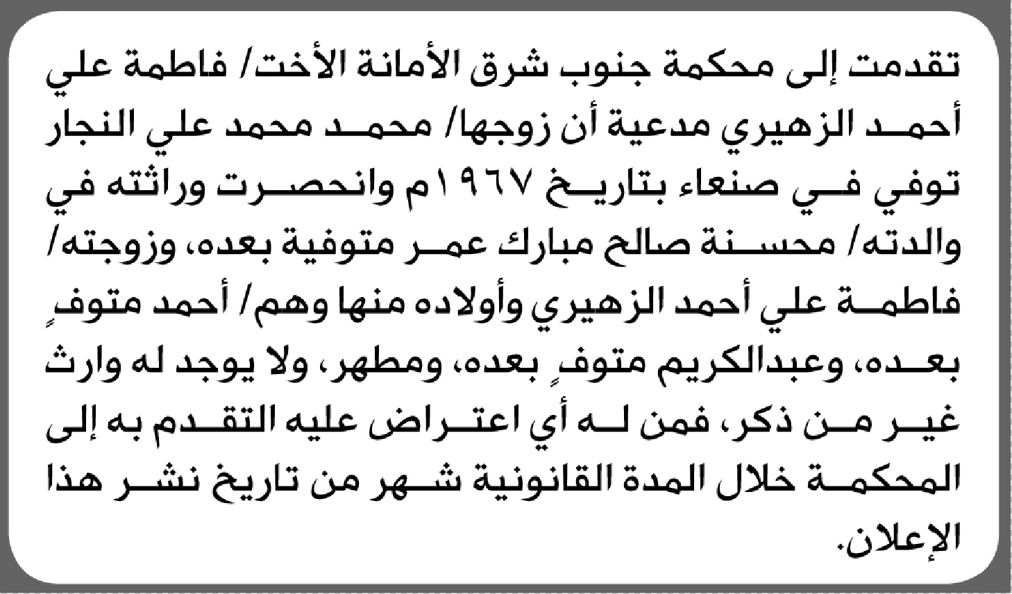 تعلن محكمة جنوب شرق الأمانة أن الأخ فاطمة الزهيري تقدمت بدعوى انحصار وراثة إعلاناتمحاكم On مارس 11, 2026 Share Share FacebookTwitterWhatsAppTelegramGoogle+البريد الإلكترونيPrint
