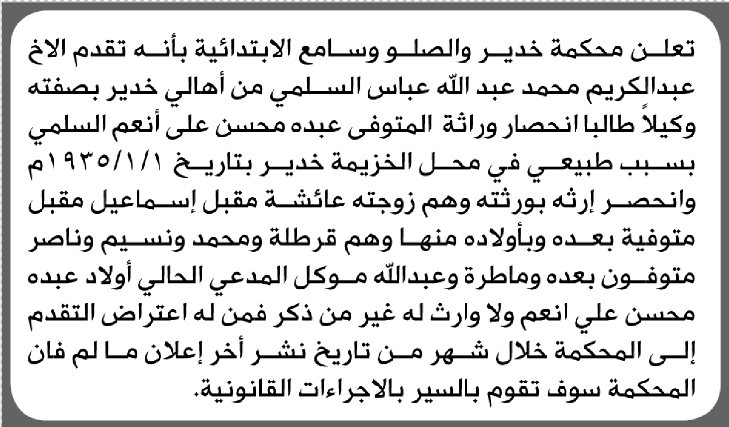 تعلن محكمة خدير أن الأخ عبدالكريم الأسلمي تقدم بدعوى انحصار وراثة إعلاناتمحاكم On مارس 11, 2026 Share Share FacebookTwitterWhatsAppTelegramGoogle+البريد الإلكترونيPrint