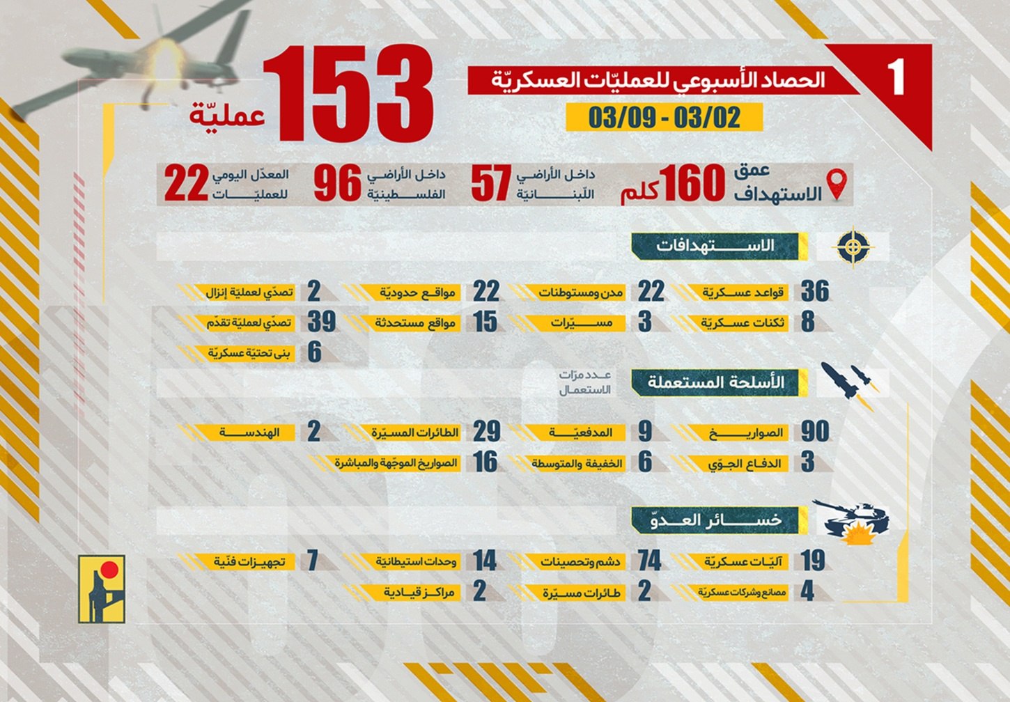 أعلنت المقاومة الإسلامية في لبنان، مساء اليوم الثلاثاء، حصيلة عملياتها العسكرية للأسبوع الممتد بين 2 و9 مارس الجاري ضد العدو الصهيوني، مؤكدة تنفيذ 153 عملية عسكرية بمعدل يومي بلغ نحو 22 عملية، فيما وصل أقصى عمق للاستهداف إلى 160 كيلومترا.