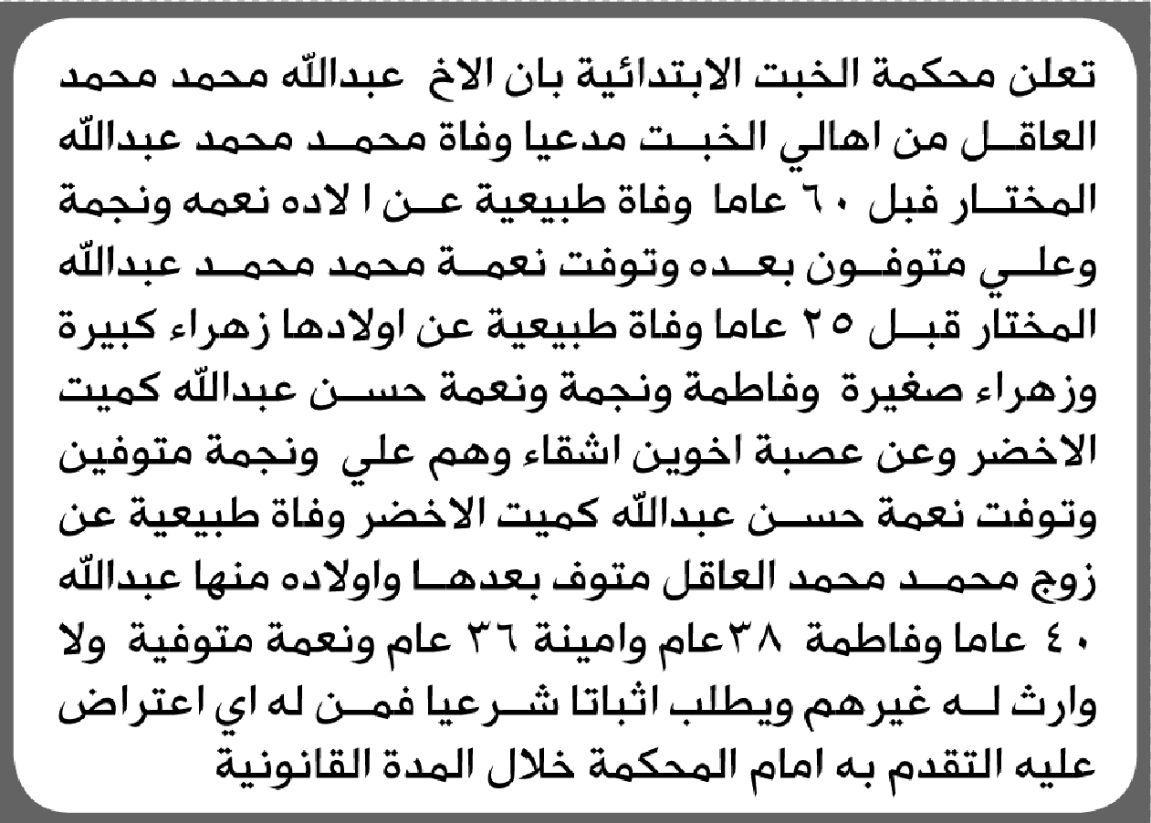 تعلن محكمة الخبت أن الأخ عبدالله العاقل تقدم بدعوى انحصار وراثة إعلاناتمحاكم On مارس 12, 2026 Share Share FacebookTwitterWhatsAppTelegramGoogle+البريد الإلكترونيPrint