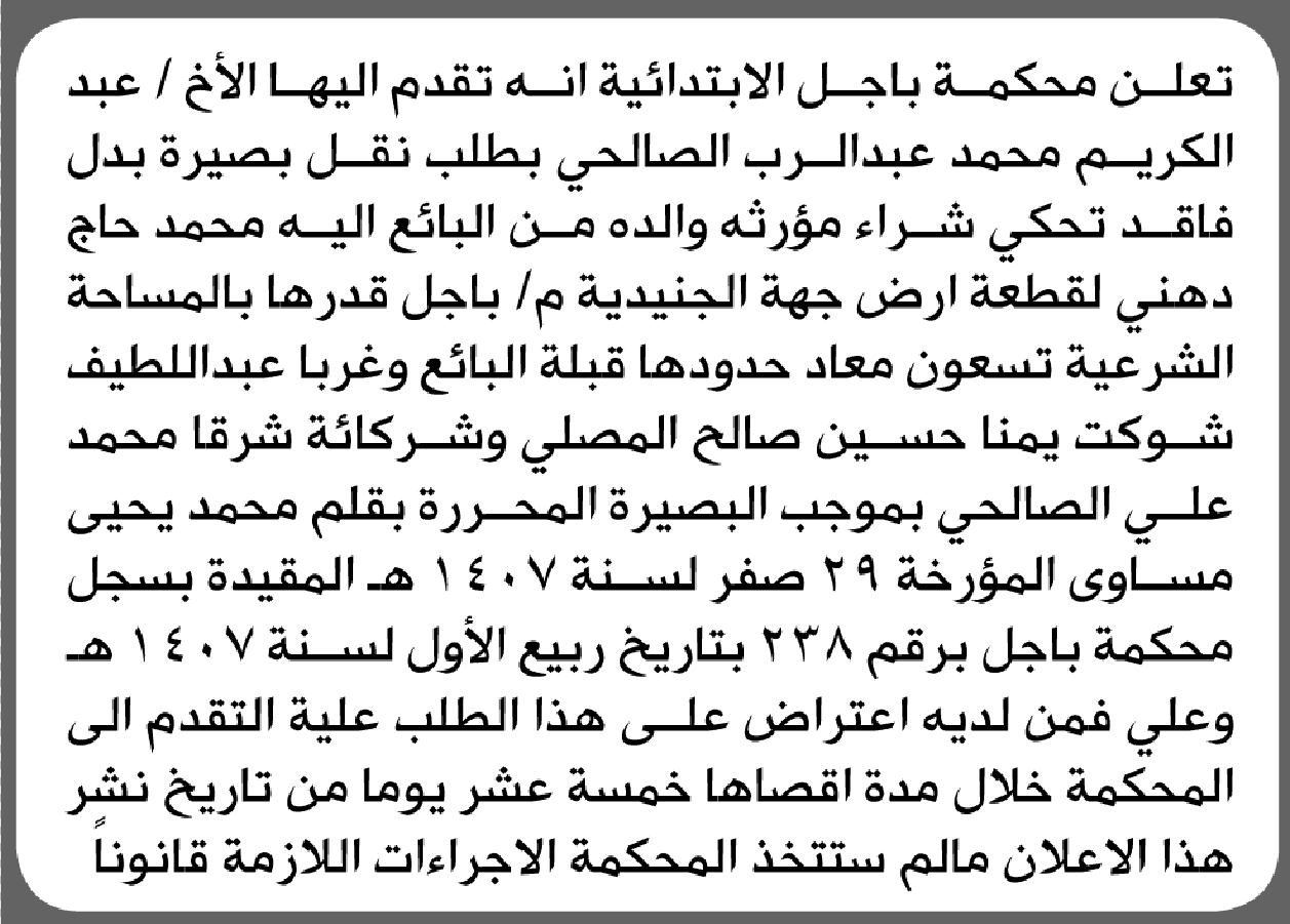 تعلن محكمة باجل أن الأخ عبدالكريم محمد الصالحي تقدم بطلب نقل بصيرة بدل فاقد إعلاناتمحاكم On مارس 12, 2026 Share Share FacebookTwitterWhatsAppTelegramGoogle+البريد الإلكترونيPrint