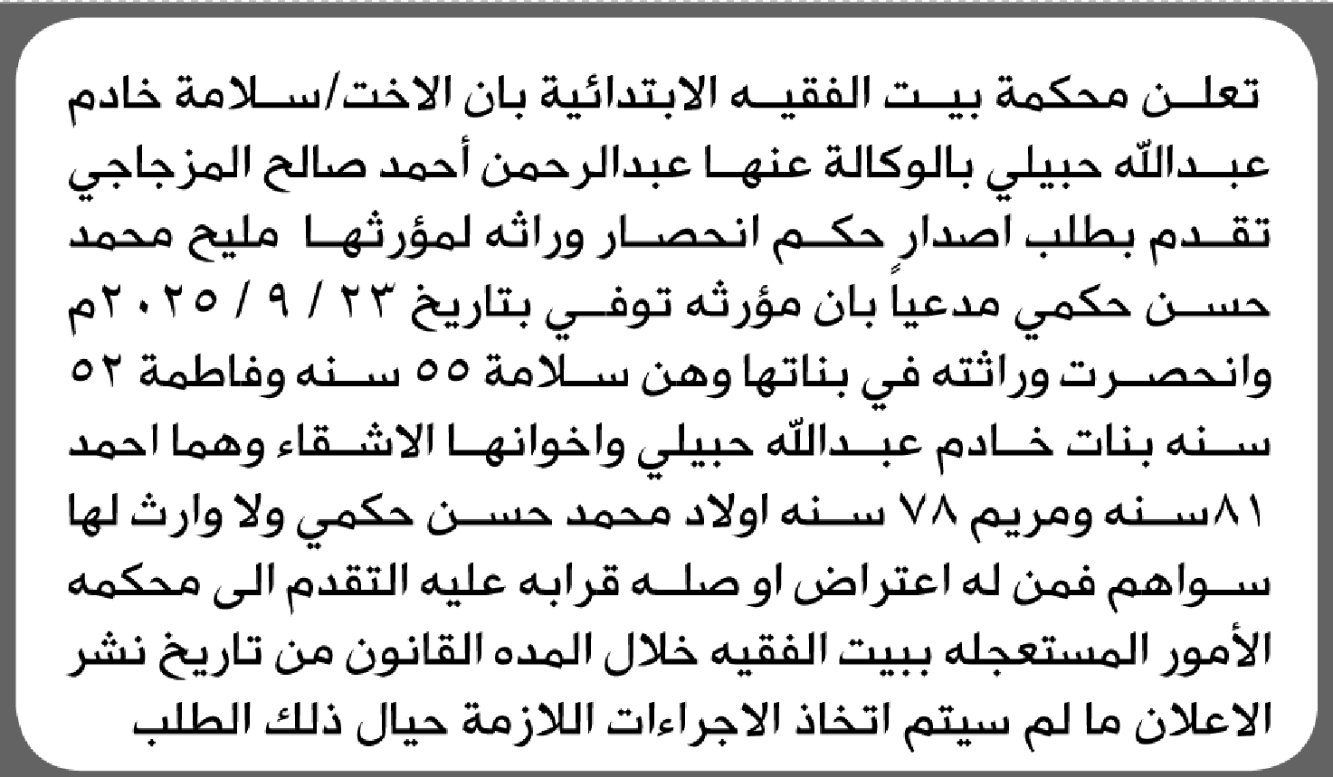 تعلن محكمة بيت الفقيه أن الأخت سلامة خادم حبيلي تقدمت بدعوى انحصار وراثة إعلاناتمحاكم On مارس 12, 2026 Share Share FacebookTwitterWhatsAppTelegramGoogle+البريد الإلكترونيPrint