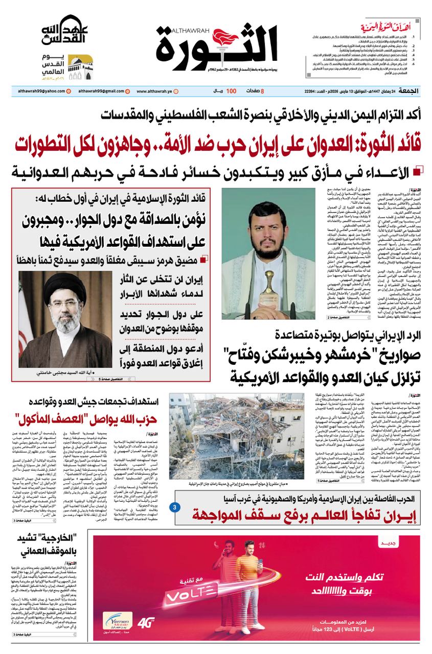 الصحيفة الورقية صحيفة الثورة الجمعة 24 رمضان 1447 – الموافق 13 مارس 2026 On مارس 13, 2026 Share View Fullscreen Share FacebookTwitterWhatsAppTelegramGoogle+البريد الإلكترونيPrint