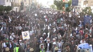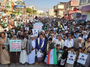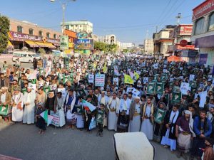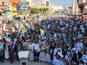 ورددت الحشود الشعارات المؤكدة،على الموقف الثابت و المبدئي لليمن تجاه القضية الفلسطينية ونصرة الشعب الفلسطيني حتى استعادة كامل أراضيه وإقامة دولته المستقلة على كامل ترابه وعاصمتها القدس الشريف..