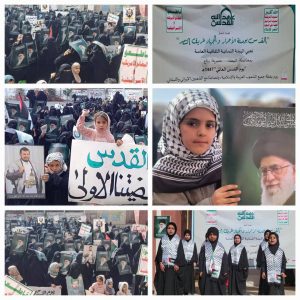 نظمت الهيئة النسائية الثقافية في محافظة البيضاء اليوم، وقفات نسائية حاشدة في مختلف المديريات إحياء ليوم القدس العالمي وتأكيدا على الموقف الإيماني الثابت لحرائر اليمن في نصرة القضية الفلسطينية والوقوف إلى جانب الشعب الفلسطيني.