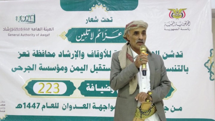 بدوره ثمن رئيس شعبة الرعاية في محافظتي تعز ولحج، مختار المغربي دور مكتب الأوقاف والسلطة المحلية في الاهتمام بجرحى ومعاقي العدوان.. مؤكداً أن هذا الإحسان يجسد روح المسؤولية الوطنية تجاه من ضحوا في سبيل حماية الوطن وصون أمنه واستقراره.