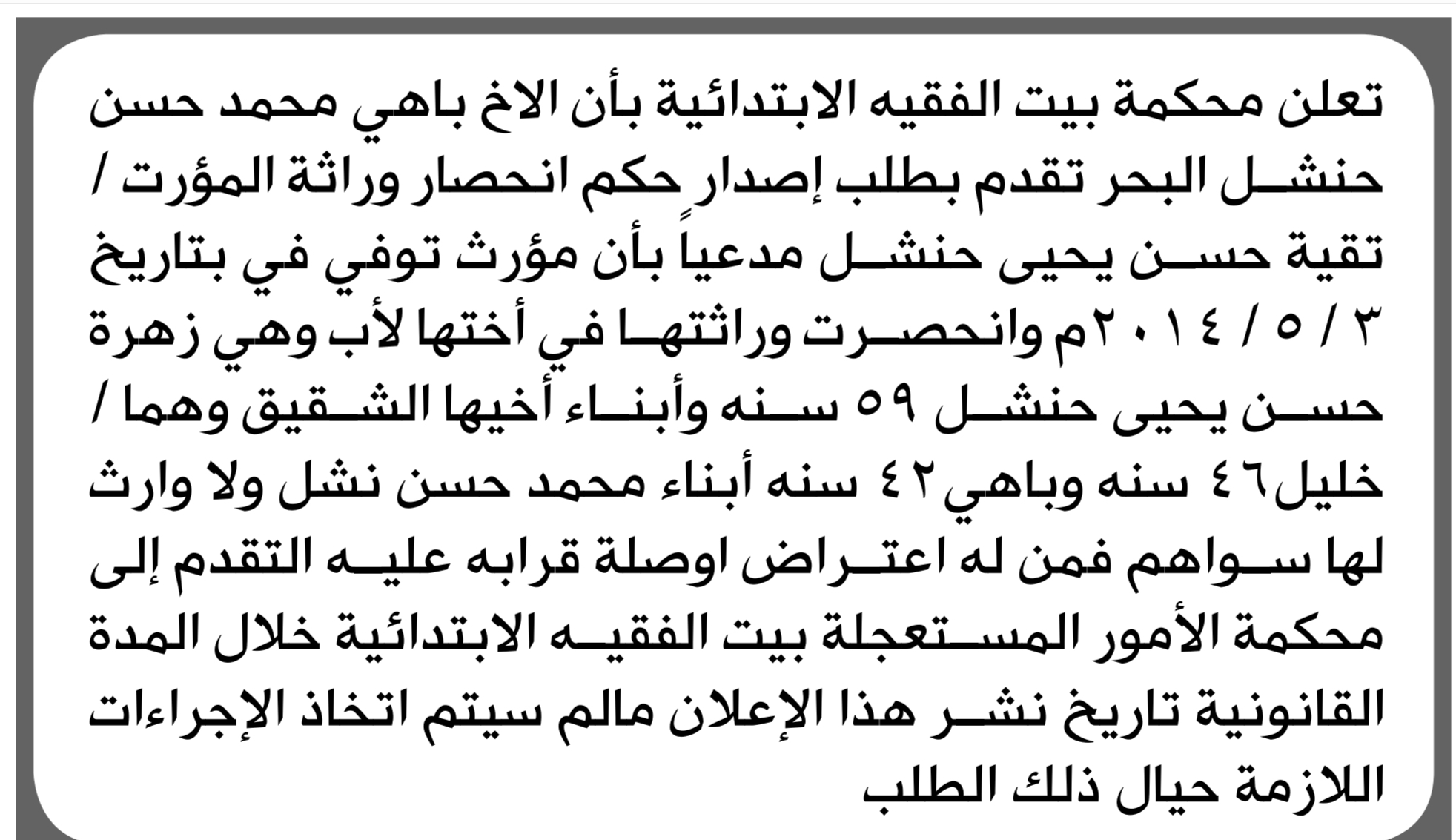 تعلن محكمة بيت الفقيه أن الأخ باهي البحر تقدم بدعوى انحصار وراثة إعلاناتمحاكم On مارس 16, 2026 Share Share FacebookTwitterWhatsAppTelegramGoogle+البريد الإلكترونيPrint