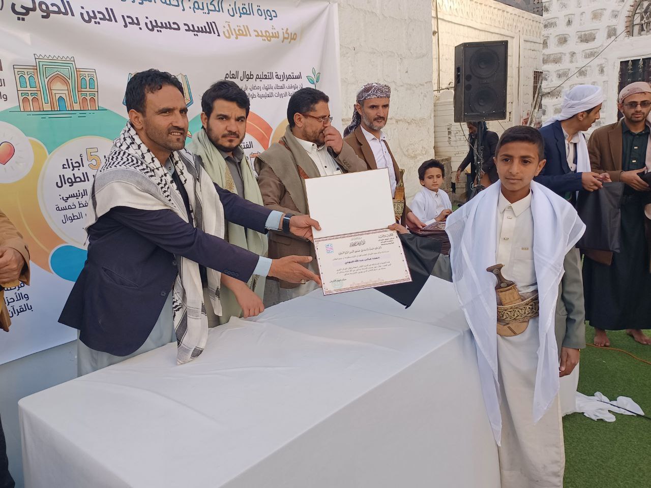 كرم مركز شهيد القرآن لتعليم القرآن الكريم وعلومه بالمدرسة الشمسية والجامع الكبير بذمار90 طالب من حفظ خمسة اجزاء من السور الطوال في الدورة الأولى لحفظ وإتقان القرآن الكريم تحت شعار (تمسكا بالقرآن في زمن هجر فيه كتاب الرحمن فعُبِد الشيطان وتجبرت على الإسلام دول الاستكبار والطغيان) بدعم من مكتب الاوقاف والارشاد بالمحافظة.